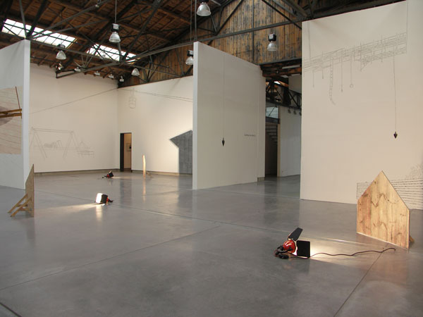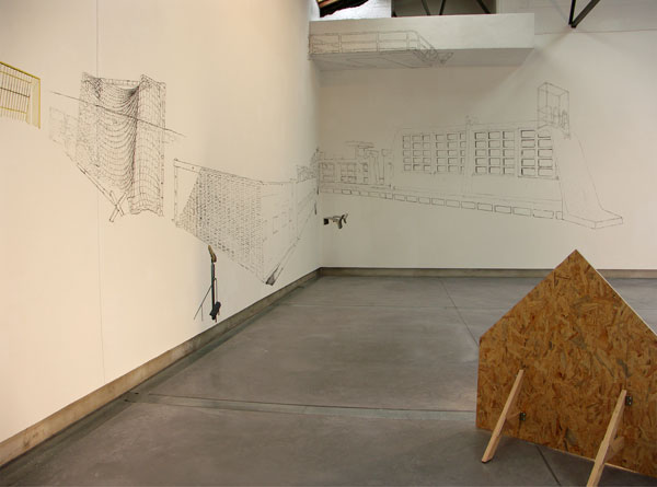 du bois consumé ; canalisée et happée par les strates denses des images en mouvement. Les espaces sont investis de lignes et de fils reconnaissables qui pourtant ont perdu leur attribut de vecteurs. Sectionnés puis réorganisés ils deviennent cordes tendues et suspendues, sillons à parcourir et à creuser, quadrillages et feuilletés toujours entr’ouverts laissant voir non ce qu’il y a derrière, mais qu’il y a un avant et un arrière. Souples et solides à la fois, étroitement entrelacées ou désunies, ces lignes, comme des portées libres, donnent à jouer et à rejouer des partitions variées à la mesure du corps. Prolongements des bras en outils de précision pour une lutte chorégraphiée ou des figures en vol. Graduations ramenant un espace trop grand à l’échelle du vivant. Cadres hors contexte pour des véhicules immobiles et des cabanes à transporter. Bases d’appui pour des corps élastiques qui se plient et se déplient, se déploient sans contraintes en gymnastes du dehors.