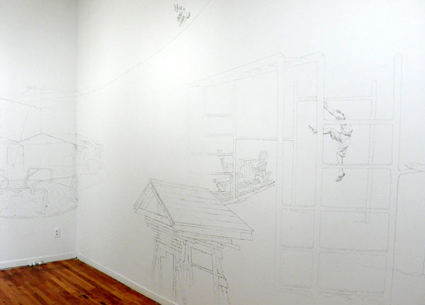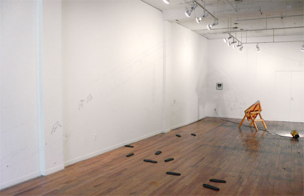 Dessins muraux, vidéo, projecteurs, semelles, pancartes, balles de ping-pong
