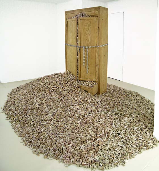 Wooden cupboard, chain, padlock, corks and imitations, 207 X 400 X 300 cm