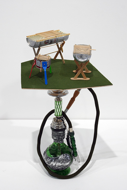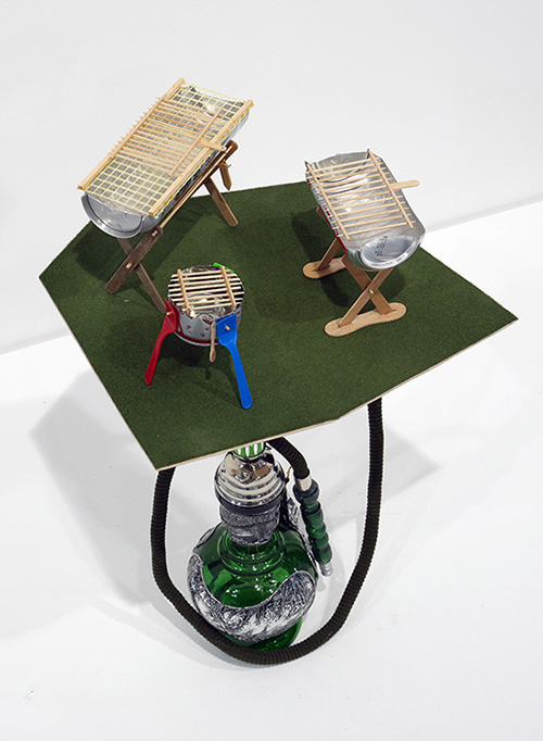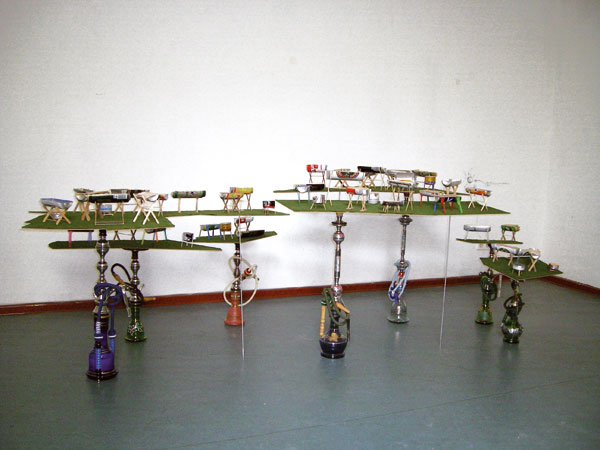 Canettes en métal, cure-dents, pique-brochettes, allumettes, grillage, bâtons de glace et mélangeurs trouvés dans la rue, flocage sur médium, shiloms, tiges aluminium, 120 x 450 x 160 cm
