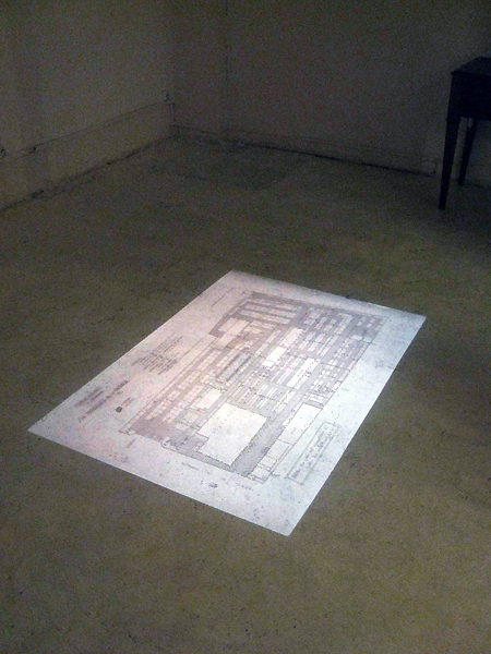 Bande sonore 214 minutes, projection d’une diapositive représentant le plan du marché sur le sol de la galerie