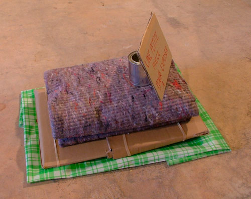 Carton, inscription, pot en métal, couverture de transport, carton plié, élastiques, toile plastifiée, 45 x 55 x 65 cm