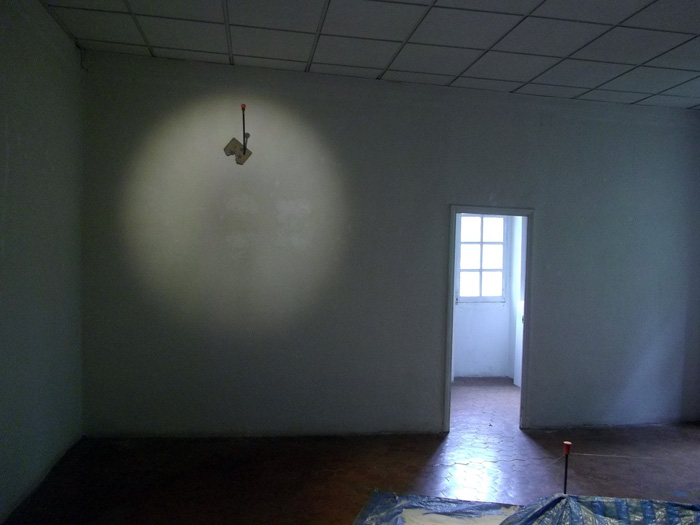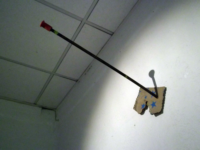 Arrêter le temps c’est ce que propose viser la lune. Une barre de chantier traverse et plante un morceau de carton, le cloue au mur comme on cloue une œuvre, un tableau. Imprimé d’étoiles bleues, le reliquat d’emballage évoque, par le biais d’un éclairage circulaire, le spectacle sous les projecteurs, la voie lactée. Le titre, en référence à cette citation d’oscar Wilde : « Il faut toujours viser la lune, car même en cas d’échec, on atterrit dans les étoiles », nous donne le ton.
