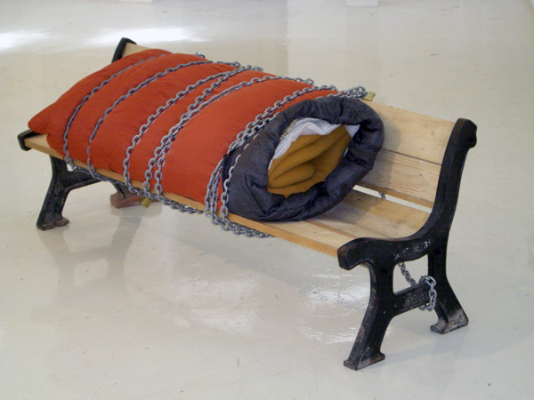 Ici, un banc public devient propriété privée d’un sans domicile. Il est constitué de matériaux de construction : bois de coffrage, brique, barres métalliques, y est enchainé un nécessaire de couchage (sac, couvertures, matelas) soit un kit de protection climatique.