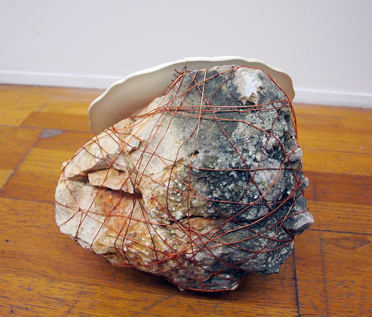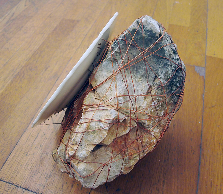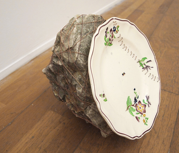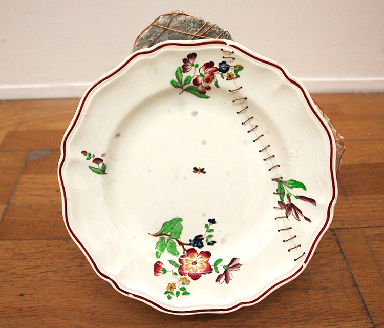 Assiette ancienne en faïence de Sarreguemines décor Strasbourg, fil de cuivre, pierre |