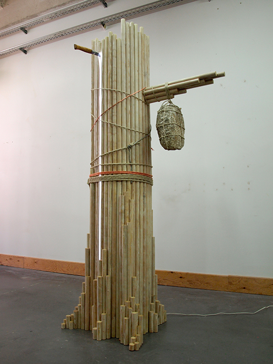 Matériaux simples, naturels et nobles dialoguent avec la fibre optique afin que l’œuvre réponde au mieux aux spécificités de l’entreprise. La sculpture opère comme signal. Elle confond les lectures symbolique et littérale des matériaux. La plupart des objets qui la composent sont récurrents dans mon travail. L’œuvre s’inspire de rites et coutumes populaires.