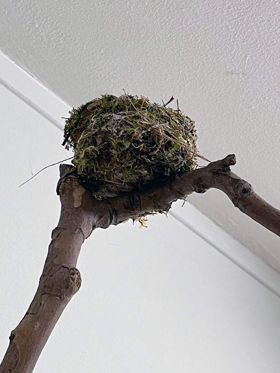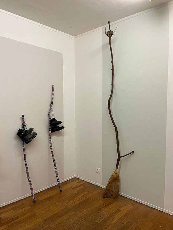 Ce monde est fou, 2025 Branche, paille d'un balai, nid, 1,85 x 15x 20 cm Vues de l'exposition À moi ! le monde, galerie du Tableau, Marseille, 2025 Photographies Jeremy Chabaud