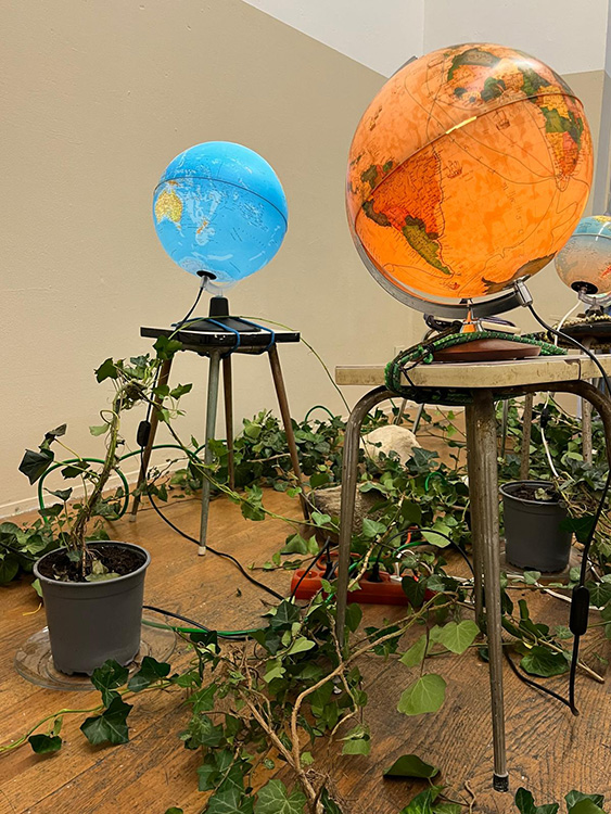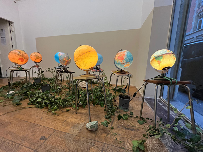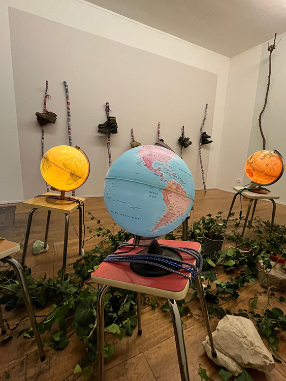 La colère des pierres, 2024 Mappemondes lumineuses, pierres, tabourets en formica, tendeurs, pots de lierre, assiettes Vues de l'exposition À moi ! le monde, galerie du Tableau, Marseille, 2025 Photographies Jeremy Chabaud