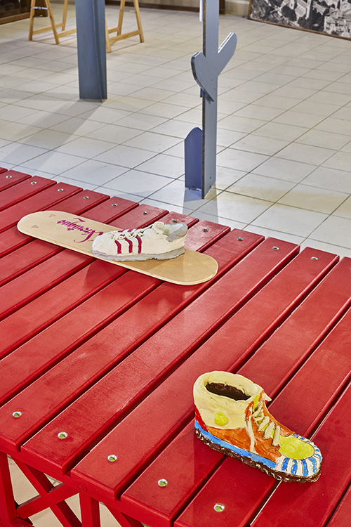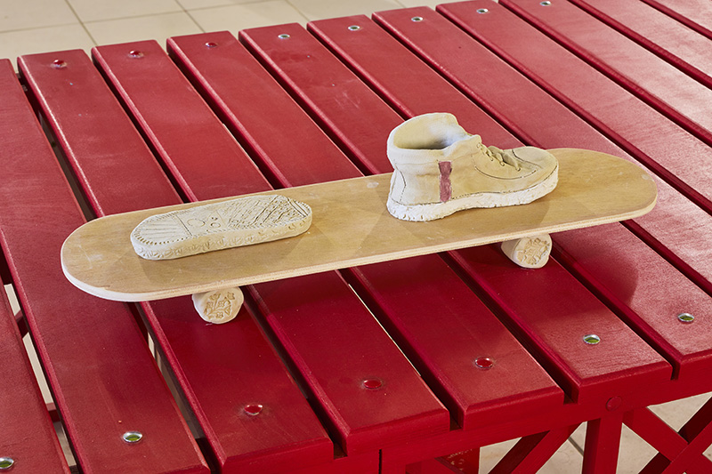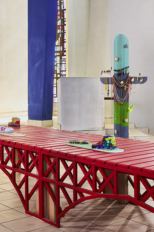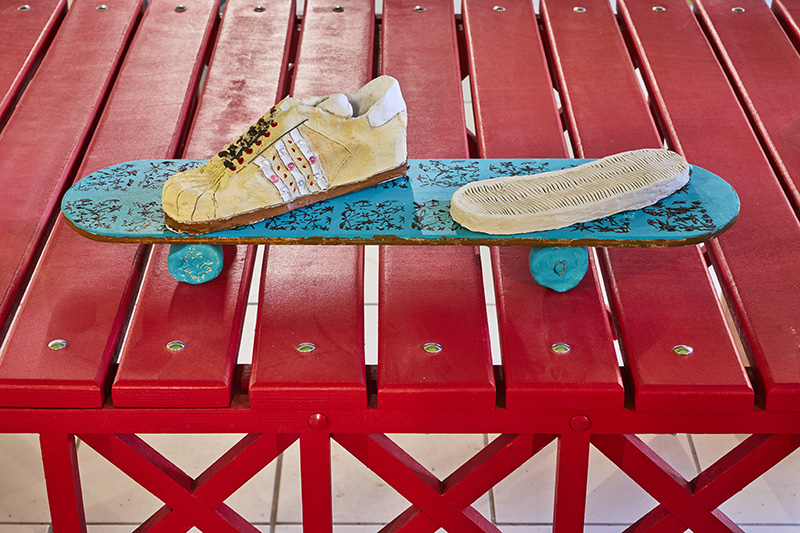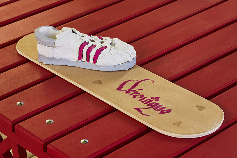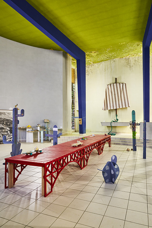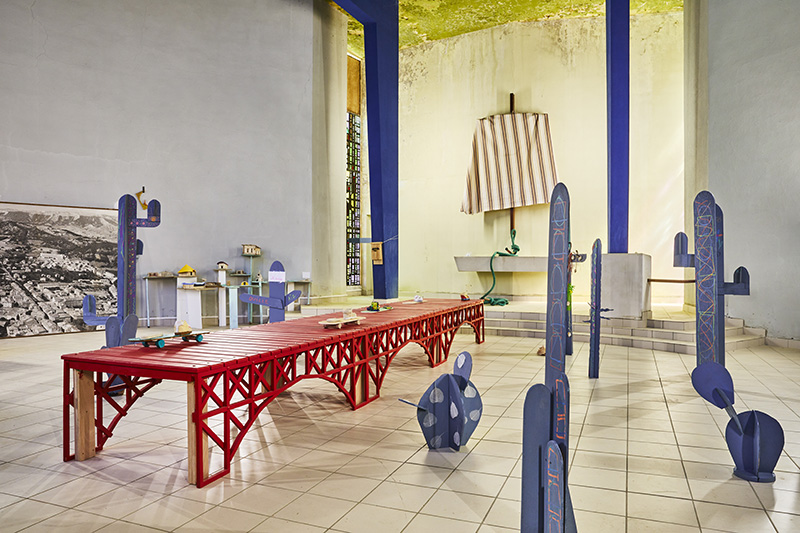 L’hôpital psychiatrique, en périphérie et pourtant si présent et si important pour la ville de Laragne, est un ilot fermé statique, de repos, que le pont relie mentalement à la ville qui est un lieu actif, dynamique, de mouvement. Un objet de communication entre la folie et le normalité qui enjambe la dépression qui les sépare. Le passage que ce pont symbolise est aussi celui que Pascale a pris pendant le temps de sa résidence, par intermittence, dans ses allées et venues entre l’hôpital, le collège, et le Centre Médico Psychologique du moulin où elle a réalisé avec les adultes qui le fréquentent, des objets qui sont eux aussi liés au déplacement : des baskets et des planches de skate- board, qui ont trouvé leur place sur la sculpture soulignant encore une fois le mouvement du passage, de la transition. Plus loin dans la perspective de l’installation, l’autel a été transformé en bateau par le recouvrement de la croix, d’une toile qui en fait une voile, et qui vient à la rencontre de celui qui est sur le pont. C’est un ponton désormais, où ce bateau pourra accoster. Dans cette chapelle, il pourrait symboliser le passage de la vie à trépas, serait-ce la barque de Charon ?
