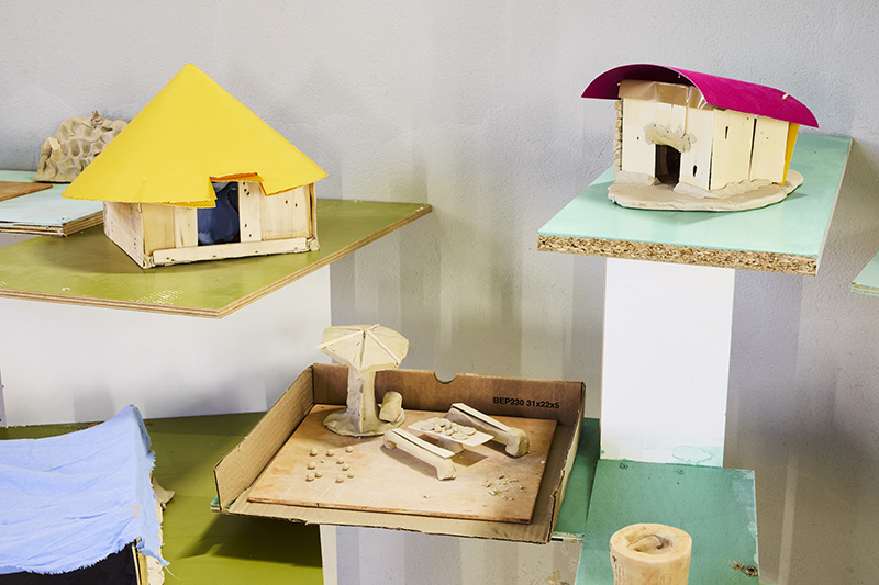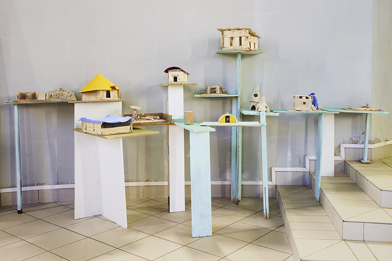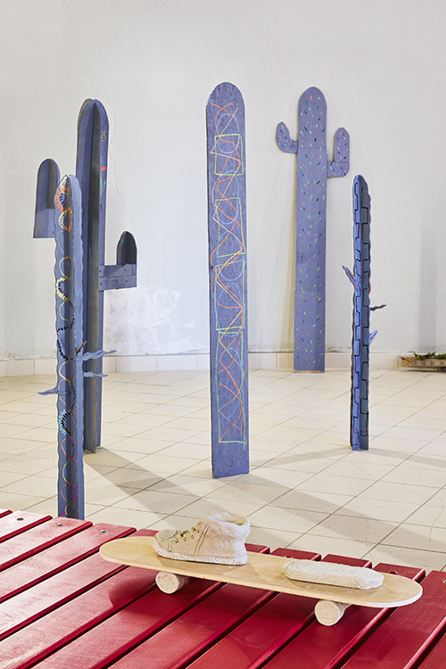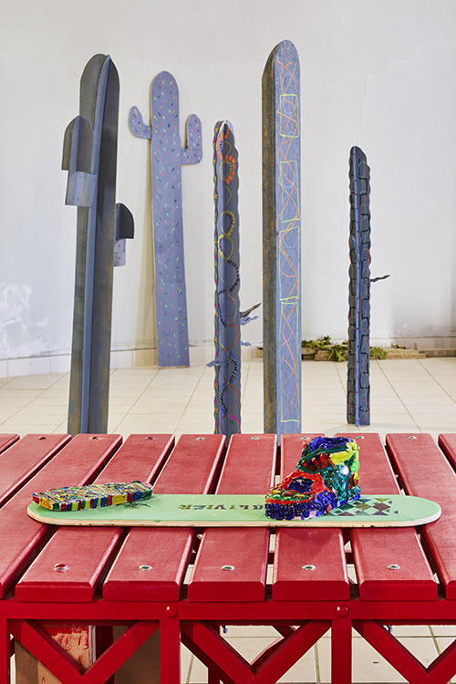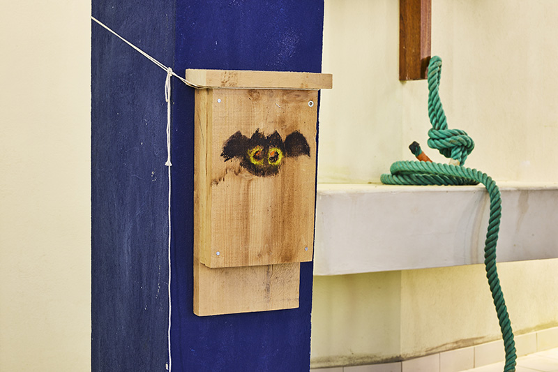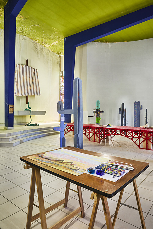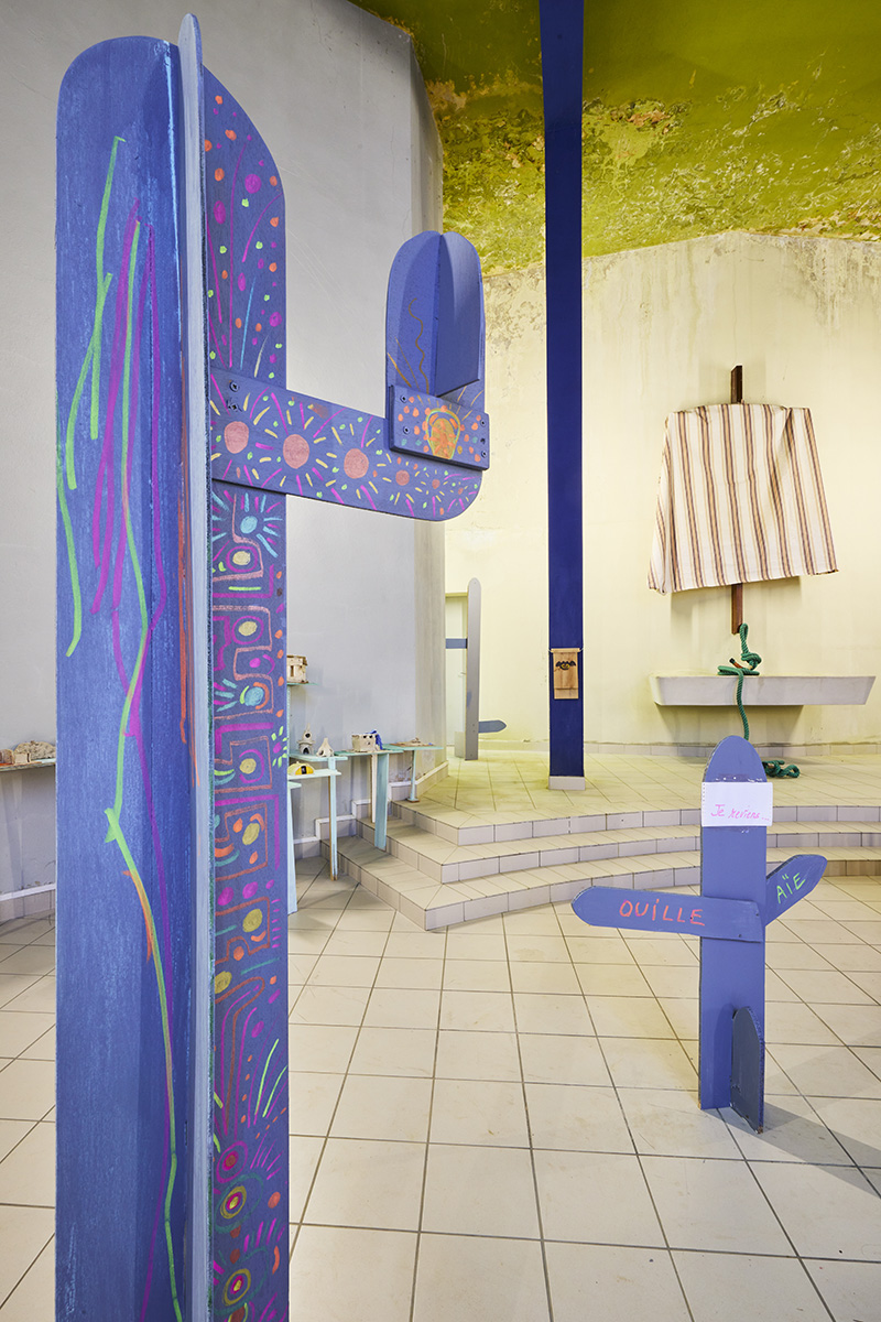 Le principe des résidences au CHBD propose l’ouverture aux patients et la liberté d’implication à ceux qui en ont envie. Potentiellement, cela fait partie des soins. Pendant toute la durée de son séjour, Pascale les a reçu dans la chapelle qui était devenue son atelier. Certains sont devenus des fidèles, des réguliers, qui ont fini par participer pleinement à son travail. En s’accaparant une des significations de ce pont à sec : la sècheresse, ils ont proposé de l’entourer de Cactus et chacun a fait le sien, l’a peint ou décoré d’objets intimes. L’un d’eux venait jouer de l’harmonica, un autre du piano désaccordé, d’autres, enfin se contentaient de passer et de rester là à regarder ou d’apporter des cadeaux : un coquillage, un bout de ficelle, des plumes, un caillou, des cadeaux qui n’ont de sens que celui de donner un bout de son intimité.