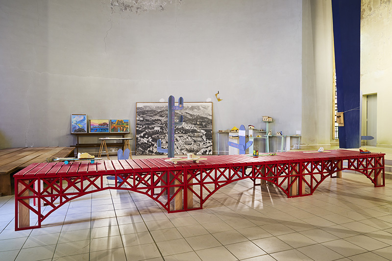 La pièce principale est un pont. Un pont émergeant d’une terre à sec où l’eau ne coule plus, mais qui aurait pu aussi servir de banc pour se reposer à l’ombre d’un arbre tout en gardant son sens premier qui est celui du passage, de la liaison, de l’échange, de la migration, de la voie du destin en quelque sorte. Le pont enjambe les frontières naturelles que sont les rivières, les ravins, les dépressions. Ces dernières sont peut-être aussi, celles que les humains essayent de surmonter ici, et qui ont inspiré Pascale Mijares.