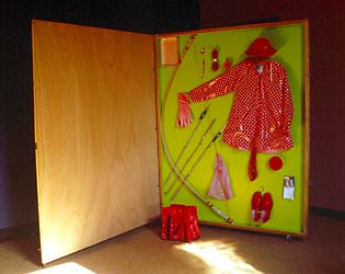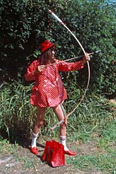 vêtements rouges, arc et flèches, accessoires divers rouges, sac rouge