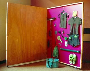 Caisse de transport de tableau, roulettes, poignées et fermoirs, vêtements verts,