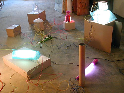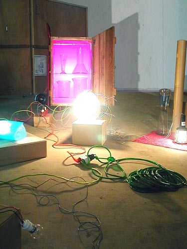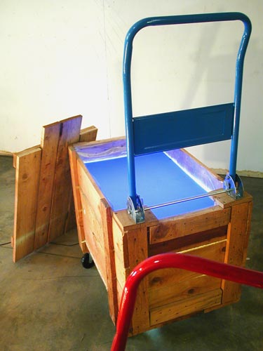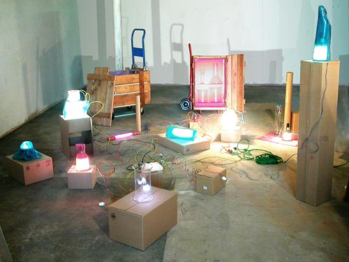 Deux caisses en bois montées sur roulettes augmentées d'éléments de chariots de transport, poignées, néons, plexis de couleur, récipients en verre, boîtes en carton, matériel électrique divers, bull-pack coloré |