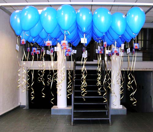 50 ballons de baudruche bleu, bolduc doré, cadre en aluminium, fil bleu, fil nylon,