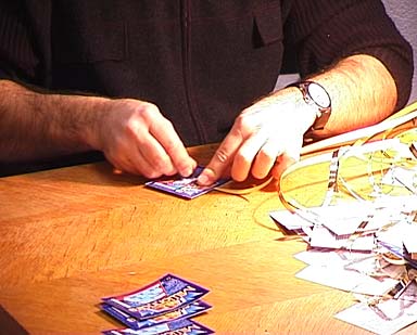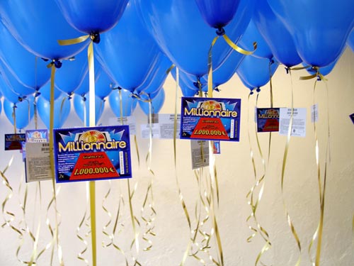 L’exposition se termine en performance festive. En fait, je découpe tous les billets et je les gratte devant le public en annonçant les gains sur une musique fellinienne.