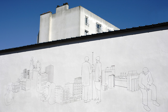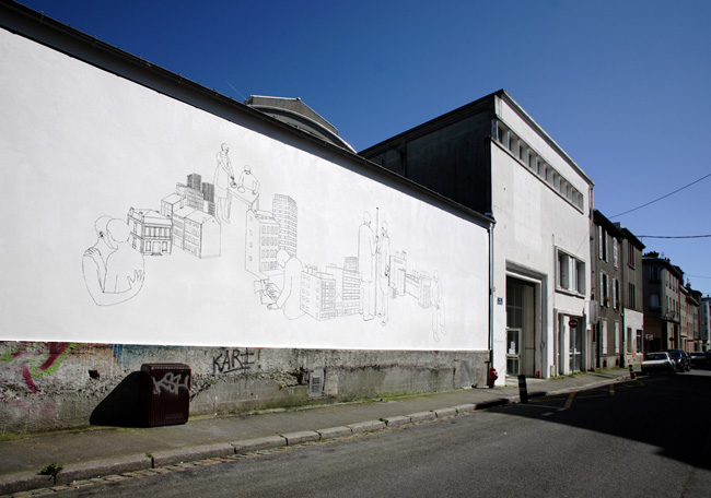 De ce constat, j’ai construit Désirs, entreprises, un panorama avec la volonté simple de réintroduire les habitants au cœur du dessin. Ceux-ci fonctionnent comme des charnières au sein de ce mural qui se déploie tel un paravent où sont articulées différentes typologies de bâti. Du construit: maison bourgeoise, immeubles, maisons d’ouvriers, usines, tours - liés par différentes situations: de l’intime au domestique, du travail au désœuvrement. Stéréotypes ou imagerie, les figures pointent certains rapports à la cité, où l’habiter et la nécessité des échanges se côtoient dans une idée de l’urbain mise en perspective, à la fois décor et terrain actif des activités humaines. |