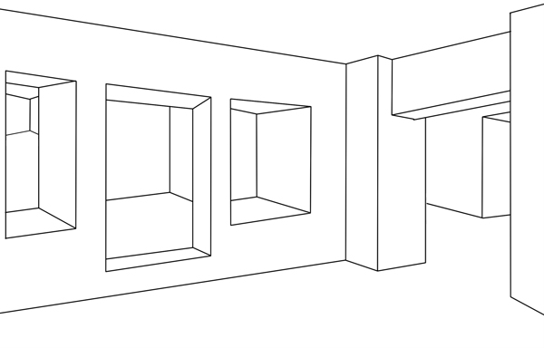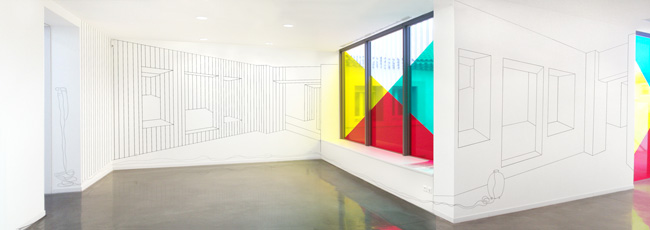 Attemps of Wall Projections (approximations included) est un dessin mural conçu pour le musée de Sérignan. Il figure un espace architectural percé de multiples ouvertures (reprenant des détails constructifs du musée même) qui se trouve “projeté” sur deux parois que l’on découvre consécutivement. Les fenêtres dessinées peuvent être aussi lues comme une série de tableaux géométriques abstraits, espaces “ouverts” accrochés sur le mur. L’illusion de la troisième dimension donnée au premier abord par la perspective n’est qu’apparence et, à y regarder de plus près, il devient visible que tout cet espace est bancal, faux, voire impossible en certains endroits, il est pure “projection” de l’esprit. Le transfert du dessin de la première paroi à la deuxième se fait via la fenêtre recouverte d’une intervention de Daniel Buren qui impressione le dessin au point de le “rayer”. Dans sa deuxième apparition, les raies aplatissent alors l’espace qui en son centre perd toute profondeur.