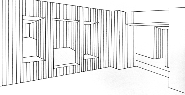 Nommé d’après l’essai de Jan Turnovsky sur la maison de Ludwig Wittgenstein, The Poetics of a Wall Projection, ainsi qu’en référence à son propre mode de fabrication (le dessin est projeté au mur pour être reproduit), convoquant les questions sur l’espace illusioniste de la perspective posées par Daniel Buren au moyen de son “outil visuel”, ce dessin joue avec les systèmes de représentation de l’espace tridimensionnel et l’illusion (et l’efficacité) de ces systèmes. Sous ses apparences de maîtrise, cette image n’est qu’approximation, les perspectives ne se recoupent pas, les raies ne sont pas de même largeur, les traits ne sont pas verticaux, etc. prenant le contrepied des dispositifs conceptuels, ramenant du trouble dans la rigueur du procédé.