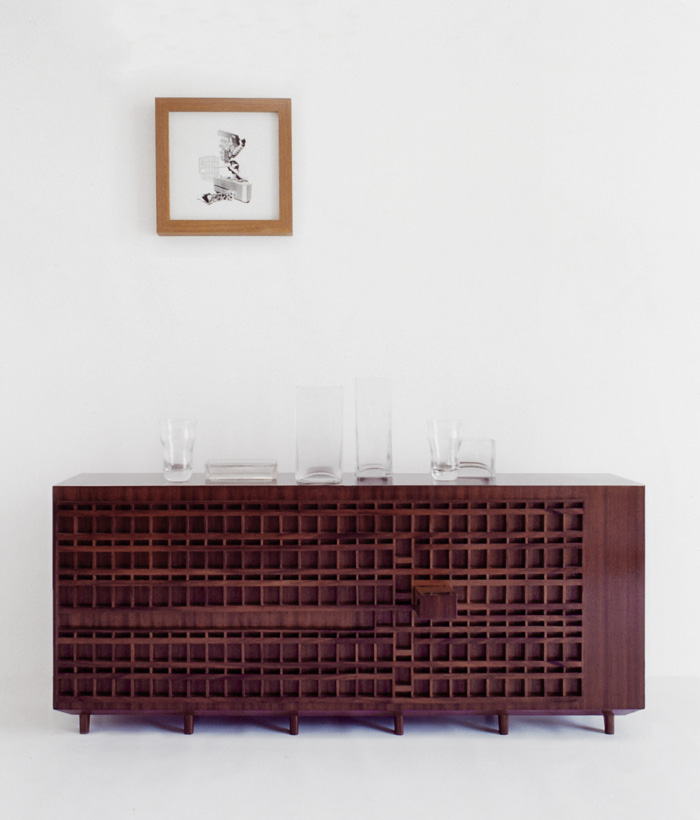 L’hypothèse d’une certaine interprétation is a transcription, a utopic building transformed into a mahogany chest of drawers. It is a wooden model of La Cité Radieuse - the beaming city - the utopic Habitation Module built in Marseille by Le Corbusier. Beyond being an ordinary tower block, La Cité Radieuse has been designed to provide high quality life for its inhabitants, mixing large and light-filled apartments with offices, an inside street with shops, a hotel, a restaurant, a small library and a kindergarten. The aim of Le Corbusier was to encourage an internal social life by organising numerous opportunities to develop relationships between neighbours.