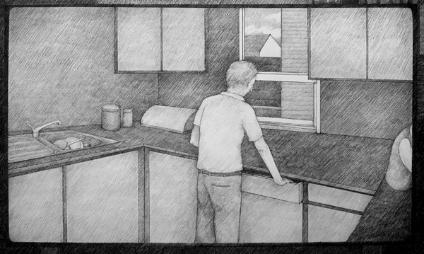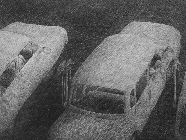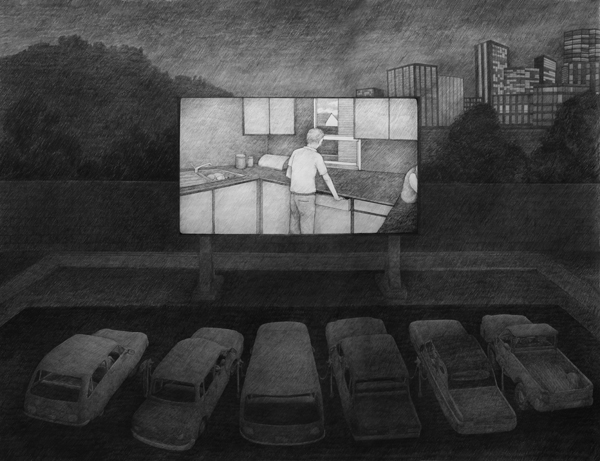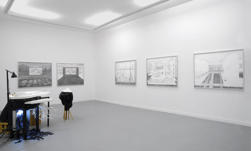 «À partie liée est une série de dessins initiée en 2007 où la ville (espace commun) et son architecture (instrument puissant de son organisation) s’envisage comme un théâtre qui met en scène la vie des habitants. L’appartement, l’immeuble, la rue, la boutique, le cinéma sont autant d’espaces construits ou vécus à des moments différents et qui, projetés sur le papier, s’imbriquent les uns dans les autres et communiquent entre eux. Leurs structures, avérées ou implicites, sont mises à jour par le travail du dessin.»