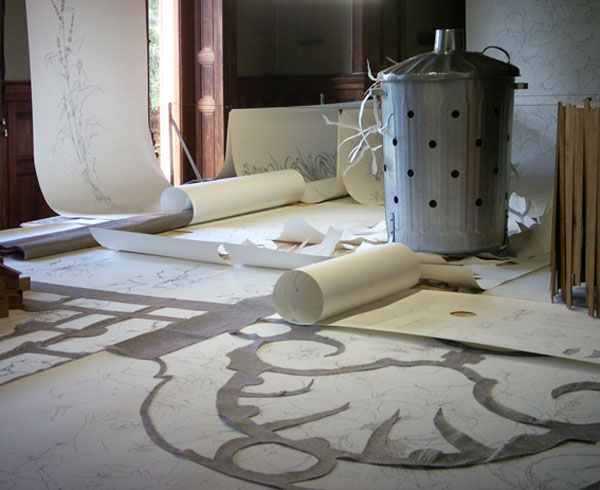 J'ai installé les dessins sur une table-estrade, d'une hauteur d'environ 1m30, qui formait une sorte d'îlot au centre de la pièce. Plutôt qu'essayer de suivre le plan d'organisation des dessins tel que décidé dans le protocole du projet, j'ai procédé de façon plus intuitive et organique. J'ai joué sur les recouvrements, superpositions, rencontres et trouées, de façon à recréer un petit paysage à la fois chaotique et organisé que l'on pouvait observer avec une certaine clarté perché sur un petit escabeau situé dans une encoche de la table. |
