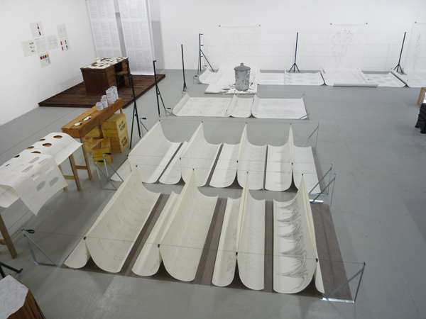 Une multitude de fiches recouvre le plateau du bureau. Couvertes d'une écriture qui se fait presque dessin, elles exposent les processus biologiques mais aussi économiques et politiques à l'œuvre dans le déroulement de la grande famine de 1845 en Irlande, où le mildiou ravagea les récoltes de pomme de terre ainsi que les semences des fermiers privant ces derniers - majoritairement métayers - de leurs droits sur des terres dont les propriétaires fonciers - majoritairement anglais - les exproprièrent en masse. Ce désastre, à l'origine horticole, contribua à envenimer le conflit anglo-irlandais et entraina une émigration massive des paysans irlandais vers les Etats-Unis."