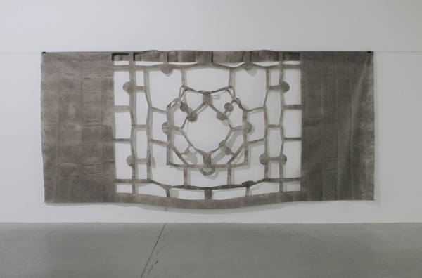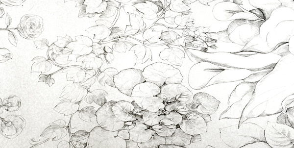 Sur un dessin de fleurs, les formes évidées en feutre horticole laissent apparaître en réserve un possible jardin. Entre le négatif et le positif se dessine une interprétation graphique, schématique, d'un jardin où la nature se trouve soumise à un potentiel décoratif.