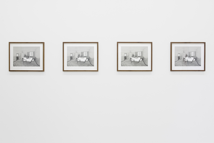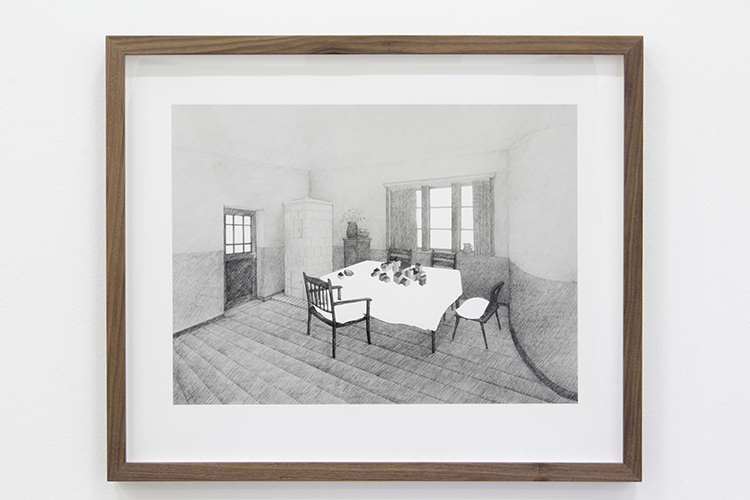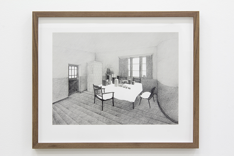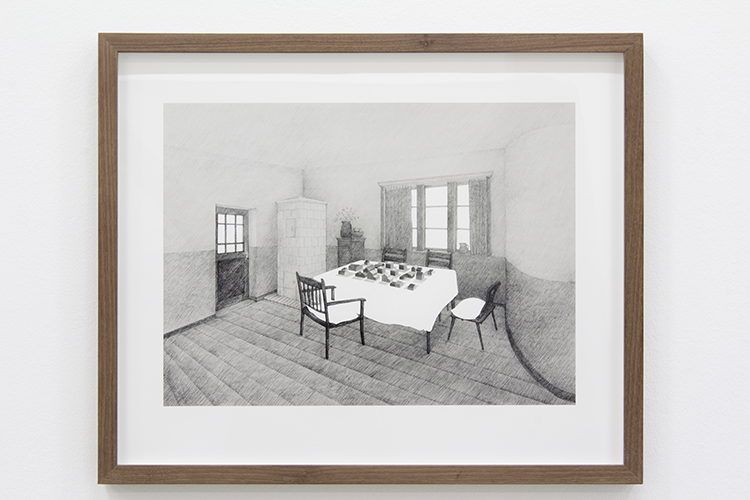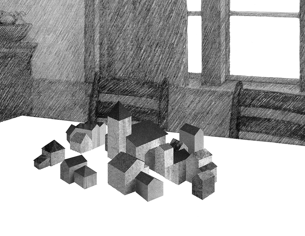 Un même espace répété à l’identique accueille des propositions urbanistiques variées. Repris des dessins de l’architecte allemand Heinrich Tessenow dans son ouvrage Wohnhausbau paru en 1927, l’intérieur dessiné est celui d’une maison champêtre allemande du début du XXème siècle. Sur la table, le blanc de la nappe accueille des blocs architectoniques disposés dans des configurations variées. Façonnés à partir de nuances de gris taillées dans des photographies d’intérieur provenant du livre de Tessenow puis collées ensemble numériquement, les