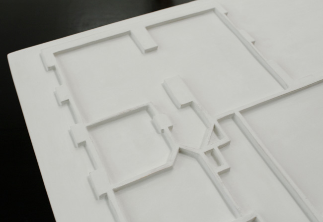Sur une colline surplombant Vienne, l'architecte sécessionniste Otto Wagner a planifié une “ville blanche”. Cet ensemble de bâtiments regroupe le Steinhof et le Baumgartenhöhe, aujourd'hui l'hôpital Otto Wagner. C'est dans le pavillon dénommé Hermann, où étaient traitées les affections pulmonaires que Thomas Bernhard passa de longues semaines et dans le pavillon Ludwig que son ami Paul Wittgenstein fût interné à de nombreuses reprise pour sa folie. L'un malade du souffle et l'autre de la raison, Bernhard narre leur amitié dans Le neveu de Wittgenstein. En parenté avec ce récit, Pavillon Ludwig combine différents éléments organisés en strates. Au sol, se déploie un enchevêtrement de branches calcinées au milieu desquelles se trouve tapi un petit module de laiton compressant une bulle de caoutchouc. De cette simili-forêt, émerge un premier plateau portant le plan du complexe hospitalier dessiné par Otto Wagner, dont les chemins forment de gracieuses volutes entre les pavillons. Le niveau suivant est une surface noire, réfléchissante tout autant que close, point intermédiaire avant le dernier plateau, blanc, où affleure en léger relief le plan du rez-de-chaussée de la maison que Ludwig Wittgenstein dessina pour sa sœur à Vienne.