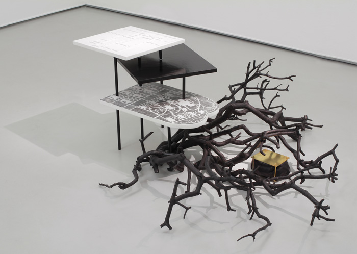 Branches calcinées, laiton, chambre à air, crayon et encre sur bois enduit, carton, caséine, métal laqué, 190 x 150 x 56 cm
