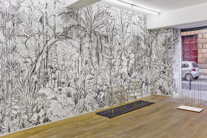 Jouant de l’idée de décor, la jungle habite le mur tout comme elle l’habille et le désigne, produisant un espace dans lequel le regard peut se perdre, mais qui reste néanmoins fondamentalement borné par les limites de l’architecture.