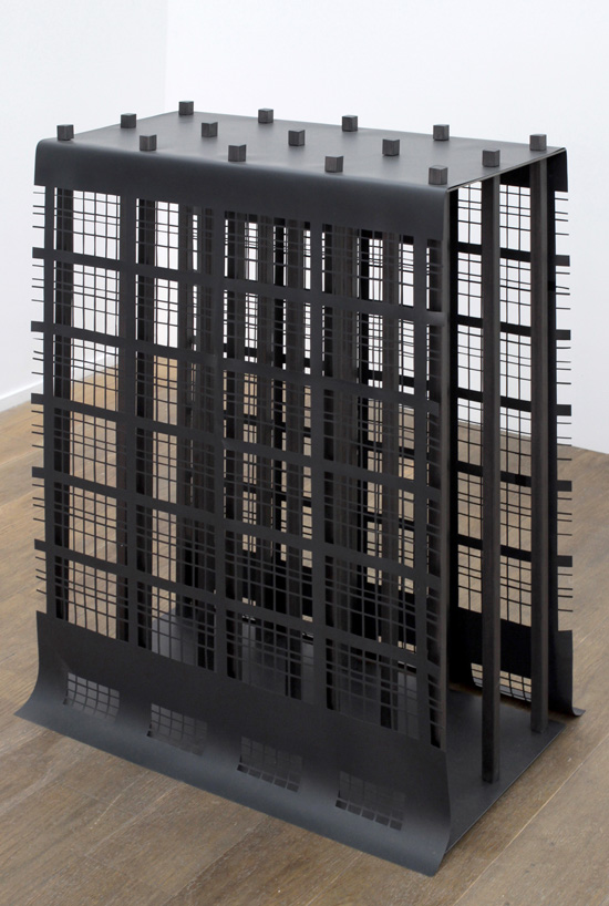 Au chaos de la jungle répond un ensemble d’objets, entre maquettes d’architecture, mobilier et sculptures, qui convoquent la rigueur géométrique de l’architecture moderne. |