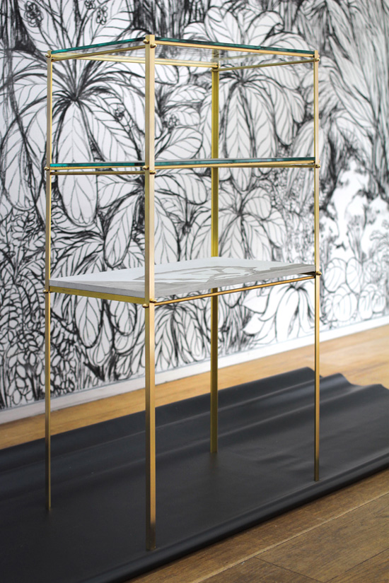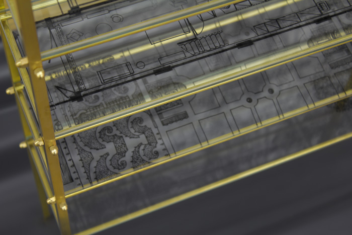 Réalisée pour la première présentation de La luxuriance sauvage de leurs ramifications au Musée d’Art Moderne de Saint Etienne, cette structure de laiton porte sur trois de ses plaques de verre les plans des duplex imbriqués de la Cité Radieuse dont Le Corbusier a construit une version à Firminy, à proximité de Saint Etienne. En contraste avec le fouillis de la forêt qui se reflète sur le verre, la rationalisation de la “machine à habiter” organise l’espace à vivre dans une efficacité ergonomique. Cette rigueur s’applique aussi au végétal dans les « étages » inférieur, où le vivant se trouve alors contraint dans les limites du strict dessin d’un jardin formel baroque. |