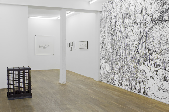 Ce dessin mural occupe l’espace dans lequel il est installé selon un protocole simple qui est de chaque fois recouvrir un mur dans son entièreté: du sol au plafond, d’un angle à l’autre. Réalisé directement au fusain sur la paroi sans suivre ni projection ni dessin préparatoire, il se transforme et “pousse” différemment à chaque nouvelle présentation. S’il change, sa densité demeure identique, le mur étant complètement empli de la végétation luxuriante, tropicale, qui occulte tout point de fuite, clairière ou respiration. Le noir du trait sur le blanc du mur produit par son accumulation et, par effet de saturation, un gris qui aplatit l’espace et fait émerger, en la singularisant, la géométrie de la paroi ainsi occupée.