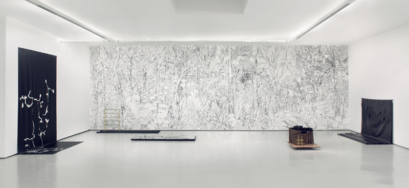 Dessin mural au fusain, bois, écorces de sapin, laiton, verre, miroir, bitume, bâche en PVC découpée, dimensions variables