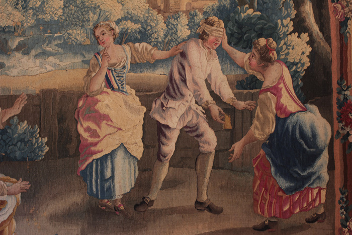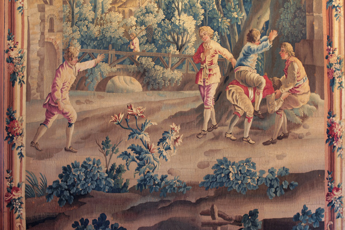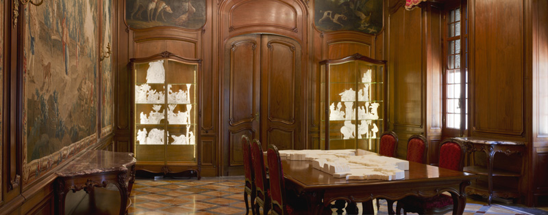 Les amusements champêtres, tentures d’Aubusson du XVIIIème siècle qui ornent les murs de la salle à manger du château d’Avignon, dépeignent des scènes bucoliques, de danse, de festin, de jeux sur fond de campagne sereine. Les personnages de ces scènes peuplent les lieux de leur gaîté mais aussi de leur mystère. Nulle référence historique ou géographique est donnée, nous sommes dans des scènes de genre, archétypales, qui exposent coutumes, figures, postures et lieux. Intelligere est phantasma speculari (ein denkraum) est une tentative de dissection de ces scènes, de mise en lumière des relations souterraines des différents éléments qui les composent et qui en font des mondes à part entière.