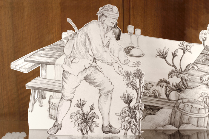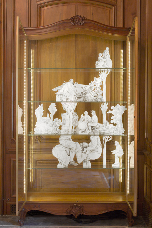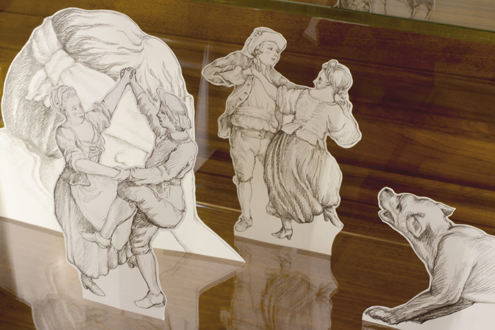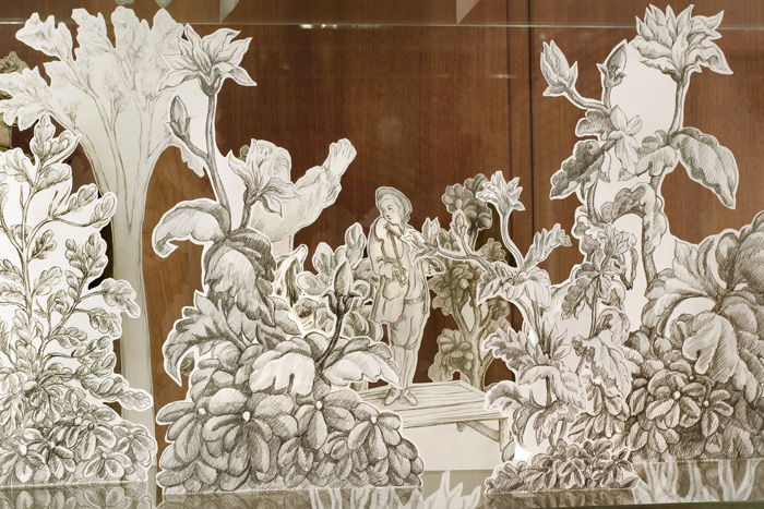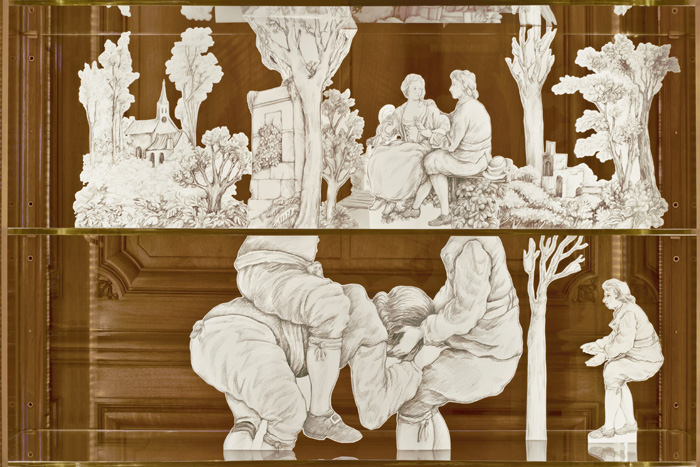 Pour disséquer il faut ouvrir. Impossible de lacérer les toiles pour faire émerger le concetto spaziale cher à Fontana, le travail d’anatomie se fera donc de façon voisine, dans les vitrines adjacentes, sous la lumière crue et entre les plaques de verre. S’y déplieront des dessins découpés des arbres et des maisons, des hommes et des femmes, les villages, ponts, chiens, moutons, buissons et arbres, gestes ingénus, évocateurs ou mystérieux de ces saynètes tissées. Ainsi que l’on peut admirer l’ingénieuse structure d’un livre pop-up en le retournant, Intelligere est phantasma speculari (ein denkraum) dépliera les images et, ce faisant, proposera d’observer la mécanique possiblement à l’œuvre au sein de ces délicieuses scènes champêtres : une anatomie de papier(3).