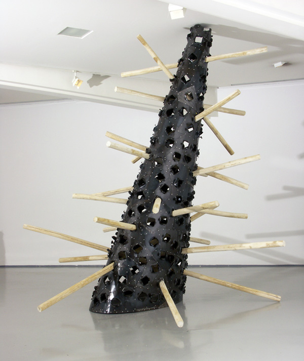 Tôle d'acier éclatée, rondins de châtaignier teints, 385 x 370 x 380 cm