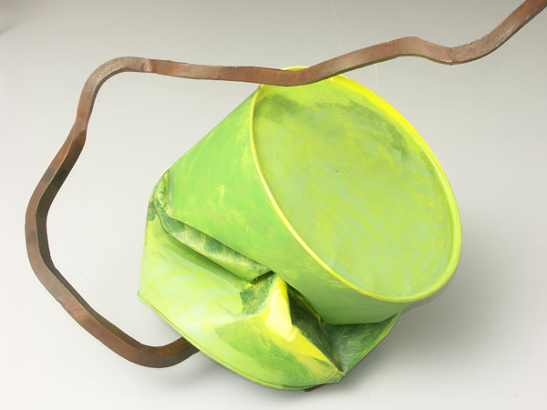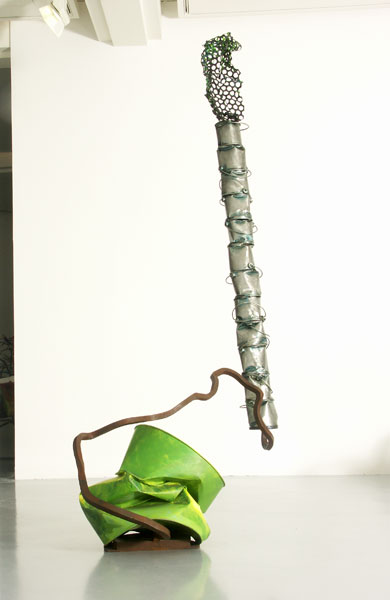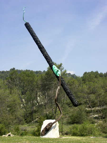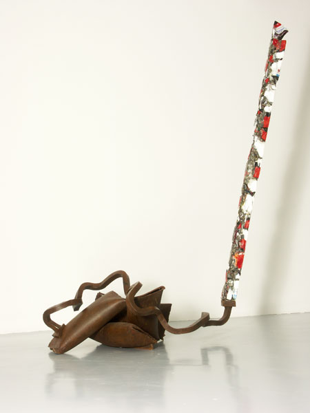 Camions de peintre, fer carré oxydé, fût peint et déformé, 310 x 180 x 90 cm