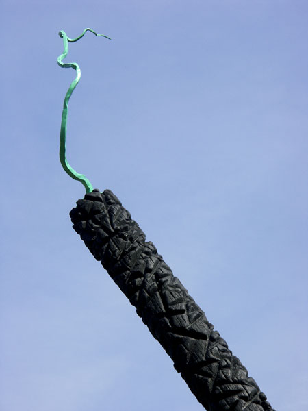 Pierre calcaire, acier oxydé ou peint, bois calciné (pin Douglas), 810 x 470 x 320 cm