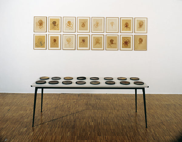 Polyptique, 16 figures, dépôt de rouille sur papier, 43 x 35 cm chaque