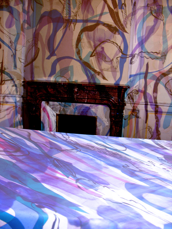 La couleur immatérielle, la lumière, est saisie et découpée (gélatines installées sur des plaques de verre, des combinaisons d’images (vidéoprojecteur + rétroprojecteur) (découpes+vidéoprojecteurs).