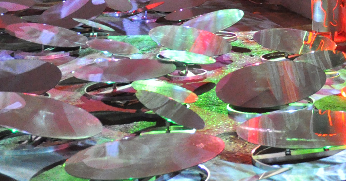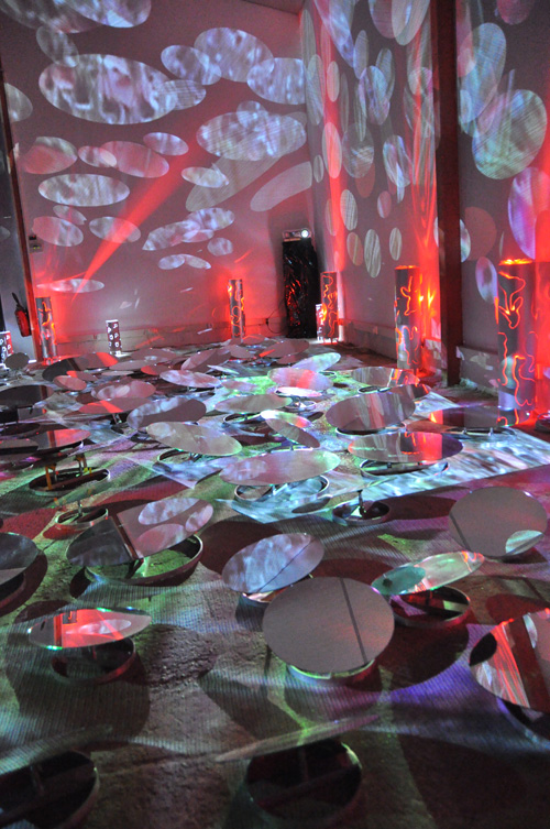 J’ai repris le principe de la lanterne magique pour un nouvel usage et recréer un espace où les jeux des lampes, des miroirs, des images mouvantes des fleurs d’été, vont définir ce qui sera une représentation reproductible à l’infini et modulable par tous les lieux et tous les temps.