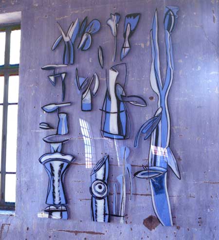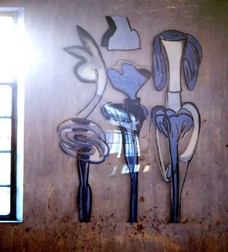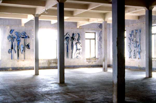 “I treated the place as an object to be ornamented, decorated, using it as the support, as if all were One, one sole space where flowers trace their shadows. Planted in front, hollowed, or cut, these develop in ordered ranks. They echo the windows, what is sky outside, what is blue inside. I looked after my plants for twenty days plotting their trails, filling in, seeding, cuttings, enormous flowers, in a gardening craze, irrigated by the intense energy coming from the light that circulates and oscillates between these walls”.
