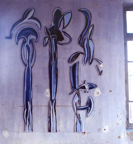 J'ai pris le lieu comme un objet à orner, à décorer, en le gardant comme support, comme si tout était Un, unique espace où les fleurs viennent tracer les ombres, plantées de face, évidées ou tranchées, elles se développent en rang en ordre, elles déclinent et reprennent les fenêtres, ce qui est le ciel dehors, ce qui est le bleu dedans. J'ai jardiné depuis vingt jours mes plantes en les traçant comme sillage, en les emplissant, semis, boutures, fleurs énormes, dans une folie jardinière, irriguée par l'intensité de l'énergie de la lumière qui circule et oscille entre ces murs.