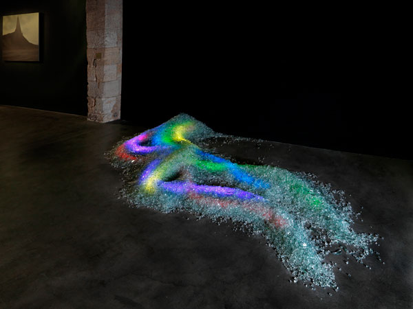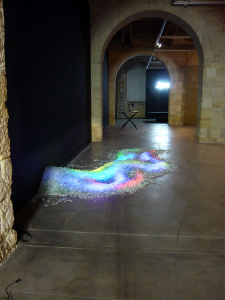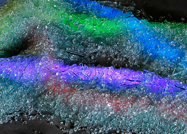 Cinq néons colorés aux couleurs de l'arc-en-ciel recouvert de verre sécurit brisé, 350 x 120 cm, h : 40 cm
