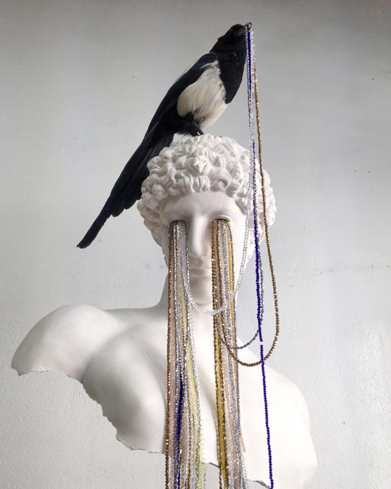 Plâtre polyester, pierres semi-précieuses, pie naturalisée