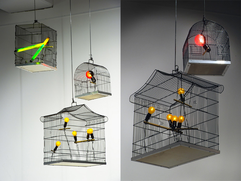 Ici, la lumière remplace le son. Les lampes à très faible consommation provenant de magasins de bricolage sont peintes de toutes les couleurs et enfermées dans des cages domestiques ; mais leur douce lumière s’en échappe.