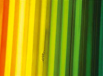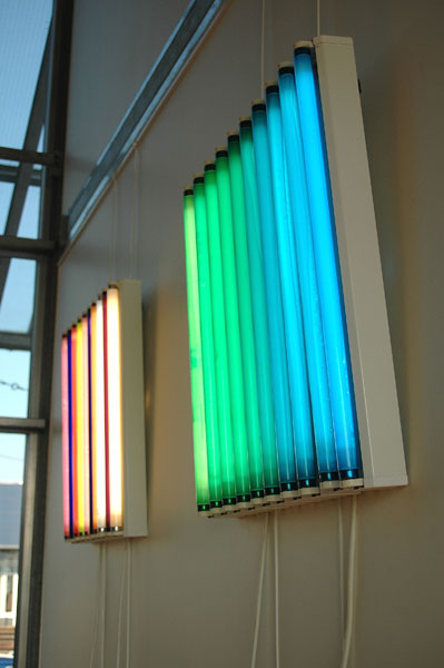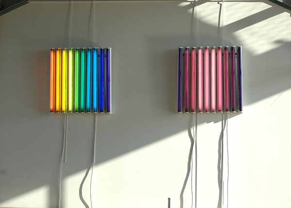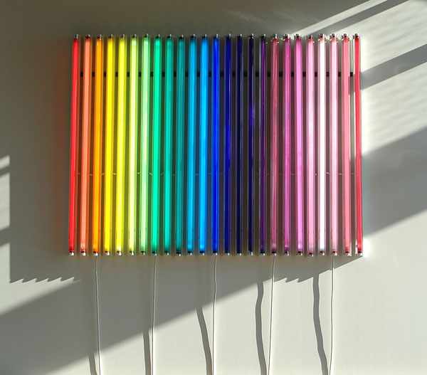 Une succession de néons colorés mis à côté pour créer un nuancier chromatique allant du rouge au rouge par 24 coloris différents